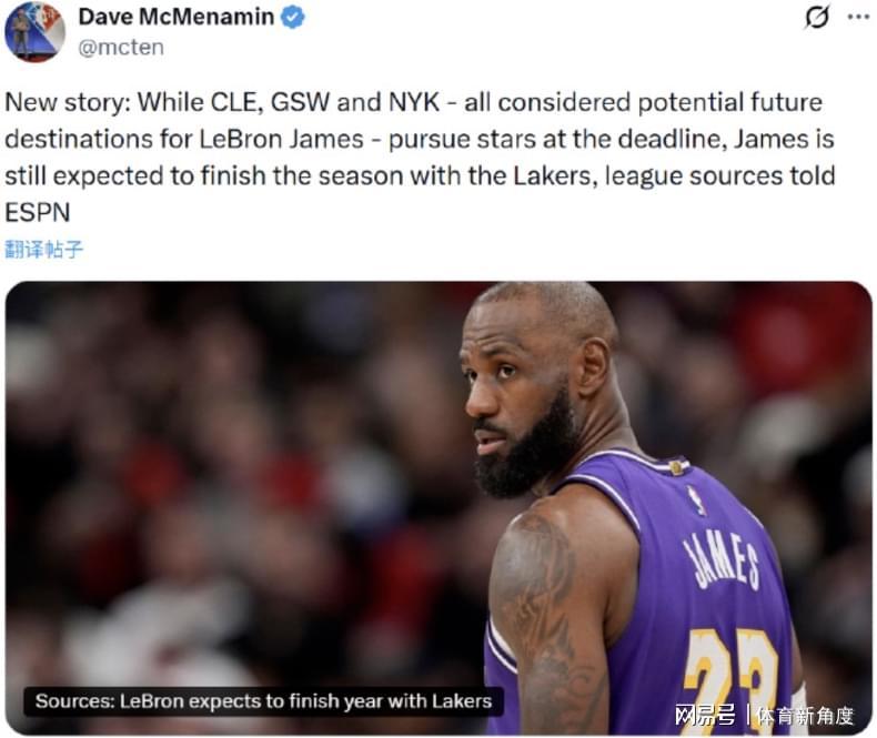现在,咱们把目光聚焦到詹姆斯身上。知名记者Dave McMenamin爆料,骑士、勇士和尼克斯,这三支球队就像三颗闪耀的星星,成为了詹姆斯未来可能的下家。然而,就在交易截止日日益临近的关键时刻,詹姆斯却做出了一个让湖人球迷欢呼雀跃的决定——他将留在湖人,打完本赛季。这就好比在狂风暴雨中,湖人这艘大船终于找到了稳定的锚点。